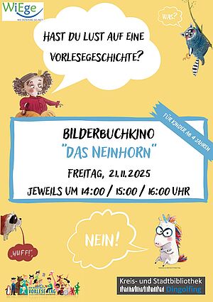 Anlässlich des bundesweiten Vorlesetages am 21.11. wird in der Kreis- & Stadtbibliothek stündlich der Klassiker "Das Neinhorn" auf der großen Leinwand gezeigt & vorgelesen: