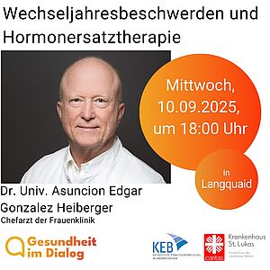 Hitzewallungen, Schlafstörungen, Stimmungsschwankungen – die Wechseljahre bringen oft große Veränderungen mit sich. Dr. Edgar Gonzalez Heiberger, Facharzt für Frauenheilkunde, erläutert in seinem Vortrag typische Beschwerden, deren Ursachen sowie Behandlungsmöglichkeiten. Darüber hinaus wird die Hormonersatztherapie als Methode zur Linderung von Wechseljahresbeschwerden vorgestellt - mit Blick auf Nutzen, Risiken und Alternativen.