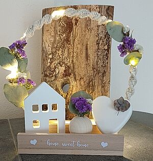 Heute basteln mal die "großen Mädels"! Zuerst wird ein Metallring mit einfacher Makrameetechnik und einer Lichterkette gestaltet, dann kreieren wir das Ganze auf Holzklötzchen und dekorieren es noch mit Raysin-Deko-Objekten und verschiedenen Trockenblumen.